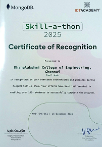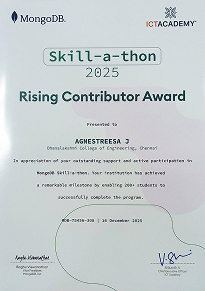 Our institution was recognized by ICT Academy for making more than 200 students to complete MongoDB Skill-A-Thon 2025 self learning certification. SPOC Ms Agnestreesa J, was appreciated for guiding the students to complete the self-learning course. On behalf of DCE, Dr Vivekanandan S J, HoD/CSE and Mr Selvaprabhu T, HoD/AIML received the Certificates during the MongoDB Academic Summit 2025