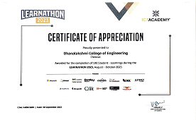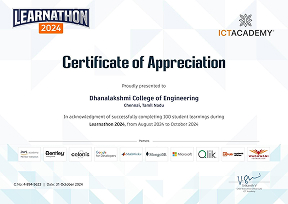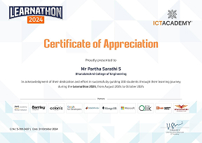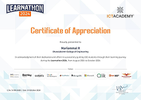 Our institution is recognized by ICT Academy for making more than 100 students to complete Learnathon 2024 self learning certification. Mr. Partha Sarathi S, ICT Coordinator and SPOC Ms Mariammal R have been appreciated for guiding the students to complete the selflearning courses successfully