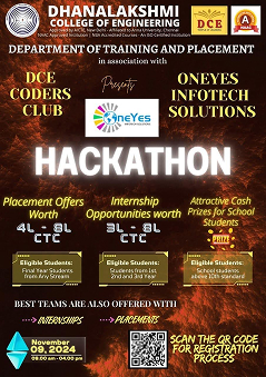 In our DCE with the Department of Training and Placement is association with DCE Coders Club and Oneyes Infotech Solutions organised “DCE Hackathon 2024”. Students identified various Domain lists and sectors being faced under different departments of the city. Augmented Reality / Virtual Reality (AR/VR), Game Design and Development, App Development, Cloud, IOT, Blockchain, Cyber Security, Robotics, Full Stack Web Development, Education, Health Care, Agriculture, Banking, Insurance, Travel, Tourism, Food, Media & Entertainment, Sports, E-Commerce, Human Resource, Automotive & Manufacturing, Textile, Aviation, Biotech, Defence Manufacturing, Construction and Telecommunication were provided to students on Hackerearth portal.